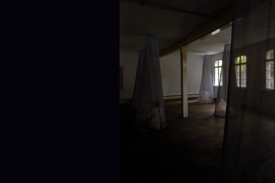 Der Zyklus aus acht Textilobjekten erinnert an Lichtkegel, deren milchige Transparenz von dunkel zu hell changiert. Eine nackte Frauengestalt ist mal liegend zu sehen, mal sich aufrichtend, um wieder schwer herab zu sinken. Die Leichtigkeit und Transparenz der Objekte kontrastiert mit dem rohen und wuchtigen Boden. So thematisiert fiat lux das Streben und Wachsen allen Lebens zum Licht, aber auch Welken und Vergehen. Die Nacktheit wirkt schutzlos, entzieht sich aber dem Blick, denn die textilen Kegel zeigen von allen Seiten lediglich den Rücken. (Fotografien Dokumentation: Bruno Weiss; Fotografien Objekte: Ursula Kreutz) 2009